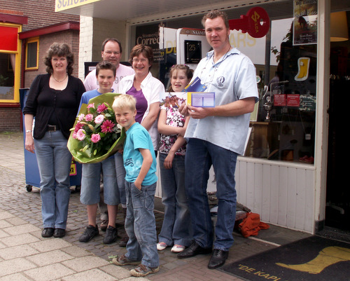 AALTEN Familie Boer deed mee met de kraslotenactie tijdens de nationale Schoenmakersgilde. Week. Van 5 tot en met 12 april organiseerde Stichting Schoenmakers Gilde voor de tweede maal een landelijke campagne. Het motto van de week was: ‘Als uw banden versleten zijn gooit u uw auto toch ook niet weg?’. Tijdens deze landelijke campagneweek ontving elke klant bij een reparatie een gratis kraslot. Dit jaar waren er honderden prijzen te winnen, variërend van schoenpoets, sneakersokken tot Van bommel of Van Lier schoenen en als klapstuk twee reischeques ter waarde van € 500,- als dubbele hoofdprijs. Een van de hoofdprijzen, de reischeque van € 500,- viel bij schoenmakerij de Kaplaars en de familie Boer ontving uit handen van Eddie en Ingrid deze mooie prijs met een prachtige bos bloemen!