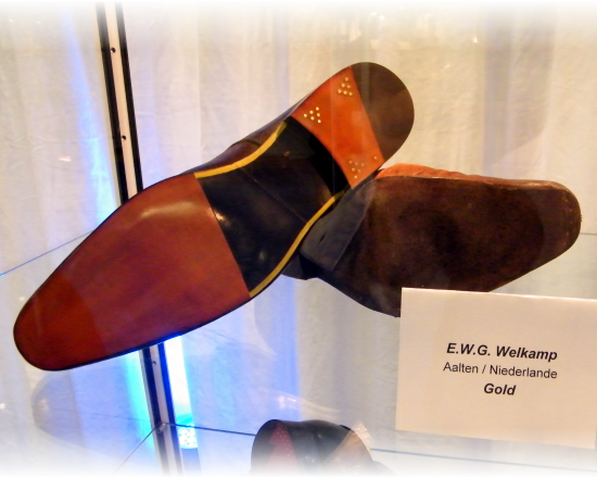 Hierboven Eddie op de foto met de voorzitter van de Duitse Schoenmakersbond en het winnende zeer gedurfde werkstuk (!)